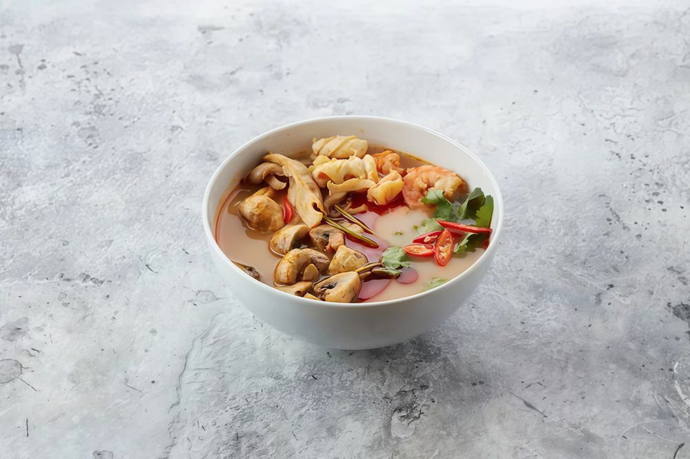 Суп с креветками, кальмарами и мидиями, на основе куриного бульона с кокосовым молоком( чашка риса)