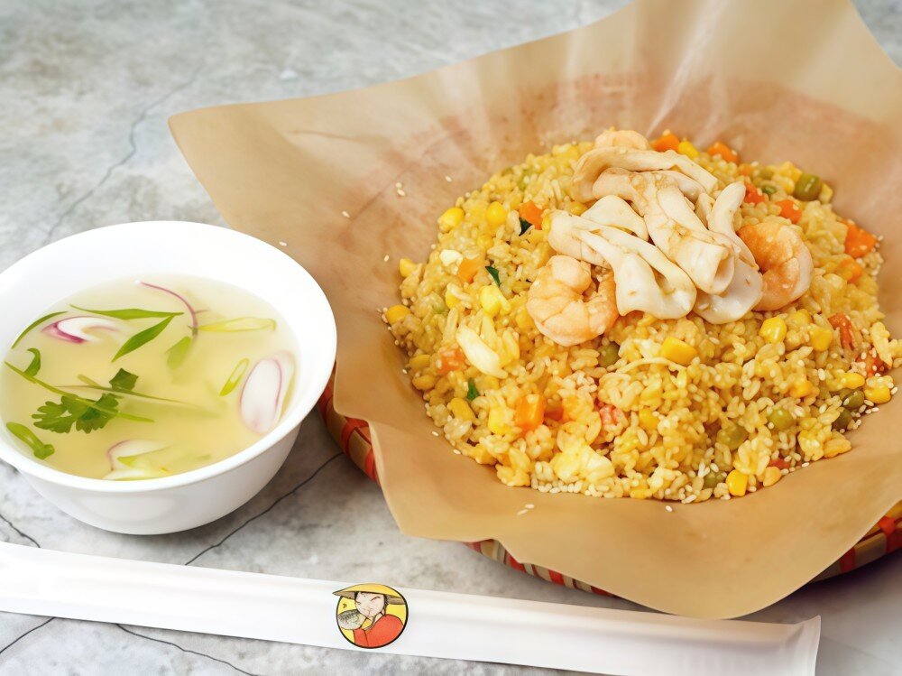 Жареный рис с креветками, кальмаром и овощами, подается с говяжьим бульоном
