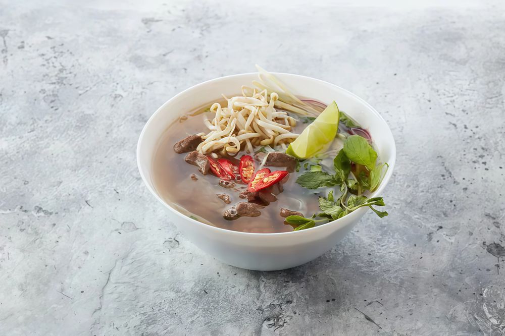 Говяжий бульон, жареная говядина, рисовая лапша, зелень, перец чили, соевые ростки, лайм(лимон)